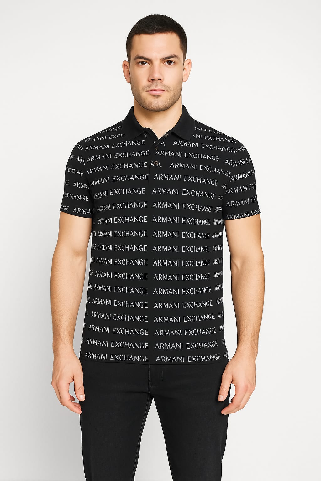 Bold and contemporary, this Armani Exchange polo shirt showcases a striking all-over logo print that reflects the brand’s unmistakable identity. Crafted from soft cotton pique, it features a classic polo collar with a three-button placket and short sleeves. The repetitive “Armani Exchange” motif across the front and back elevates the design with a dynamic edge, making it a statement piece for modern street-luxe styling.