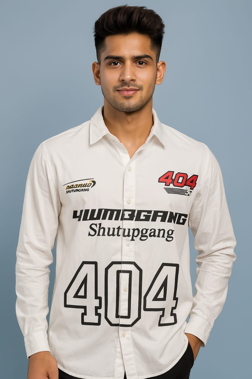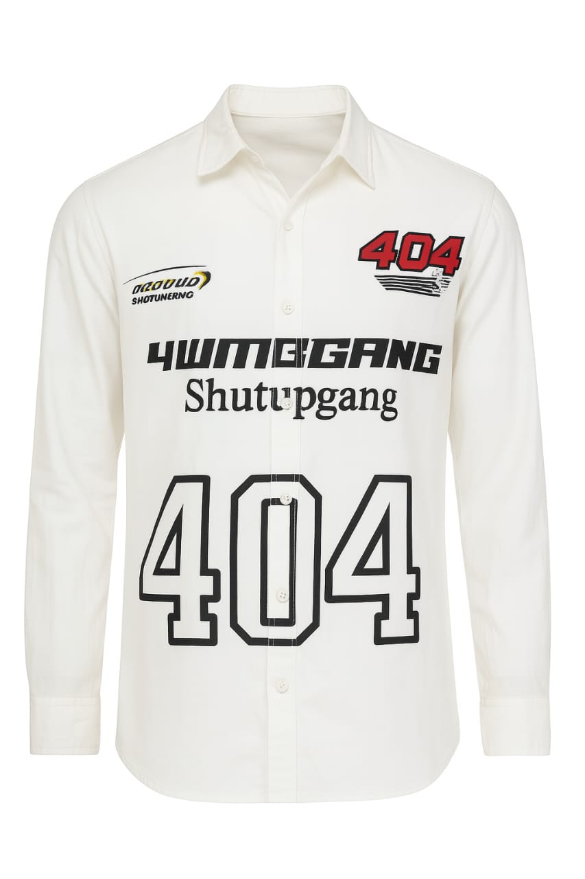 Streetwear attitude meets bold graphic design in this statement shirt. Crafted in a classic button-down silhouette, the piece is elevated with oversized printed motifs across the front, including “404” numerals and layered branding accents. The spread collar and long sleeves add structure, while the all-black base provides a sharp contrast that highlights the striking logos. Designed for those who embrace individuality, this shirt delivers a fearless edge to contemporary street style.