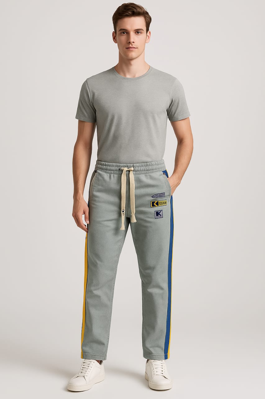 Dynamic and versatile, these jogger pants bring together a streetwear aesthetic with athletic-inspired detailing. Crafted from soft denim-wash fabric, the design is elevated with bold contrast side stripes in vibrant blue and yellow, adding a striking edge to the relaxed silhouette. An elasticated waistband with a drawstring tie ensures comfort and adjustability, while embroidered logo patches on the front reinforce the statement-making style. Perfect for casual layering or standout streetwear looks.