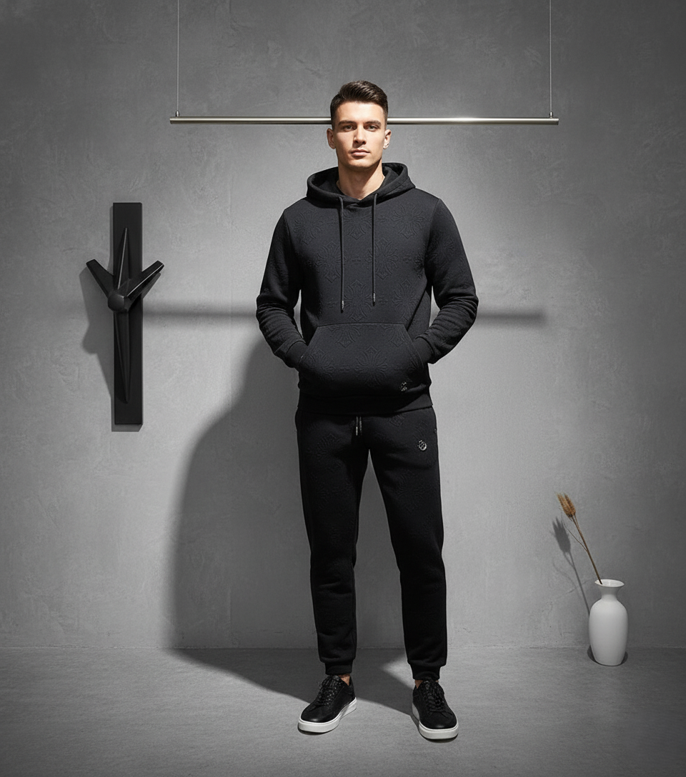 Embrace luxurious comfort and distinctive style with this premium white matching tracksuit. Crafted from a soft, high-quality fabric, both the hoodie and sweatpants feature an elegant all-over embossed floral or cross-like pattern, adding a sophisticated tactile dimension. The set is subtly accented with black details, including drawstrings and a prominent black cross emblem on the sweatpants, offering a modern and cohesive look perfect for elevated loungewear or stylish casual outings.