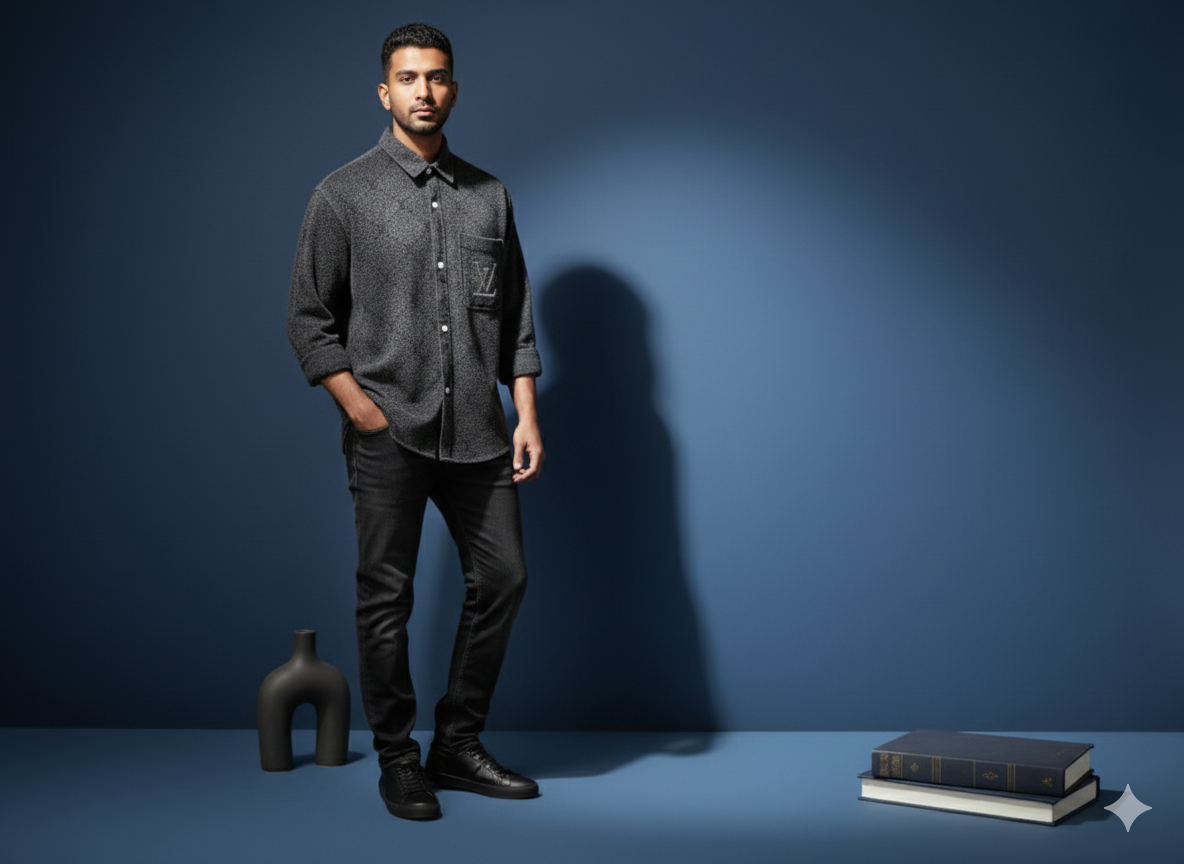 This premium dark-toned shirt blends understated luxury with modern streetwear sensibility. Crafted from fine textured fabric, it features a classic button-down silhouette with a pointed collar and single chest pocket adorned with the iconic LV detail. Sleek and versatile, the shirt works effortlessly as both casual wear and a refined layering piece.